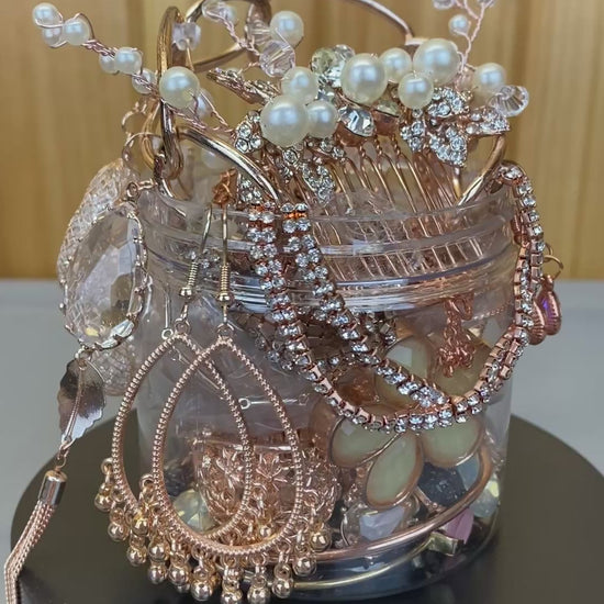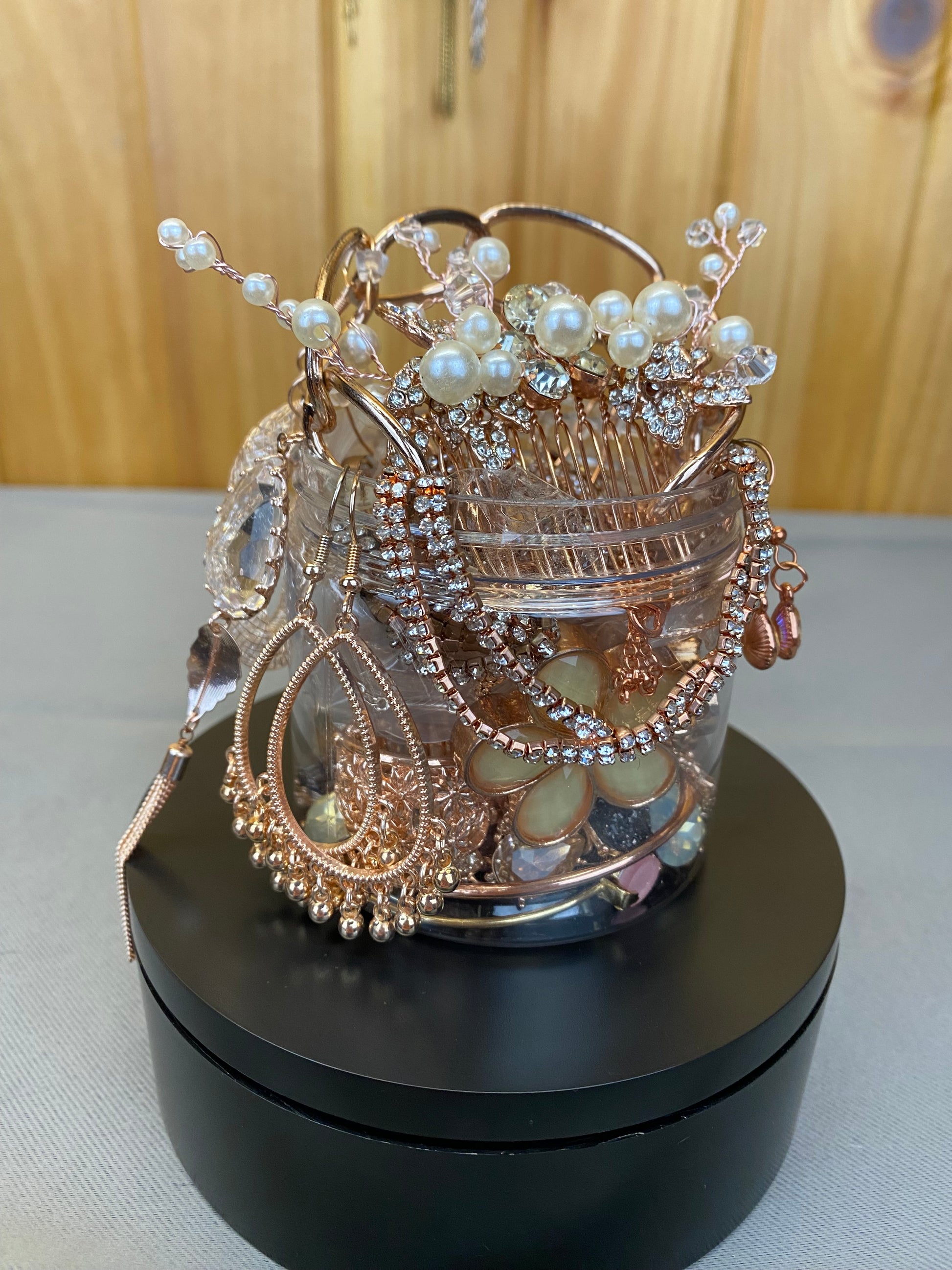 Unwrap the thrill of gorgeous jewelry with our hand-inspected and packed Jewelry JAR! Each jar is filled to the brim with an exciting variety of earrings, bracelets, necklaces, and rings – no two jars are exactly alike!